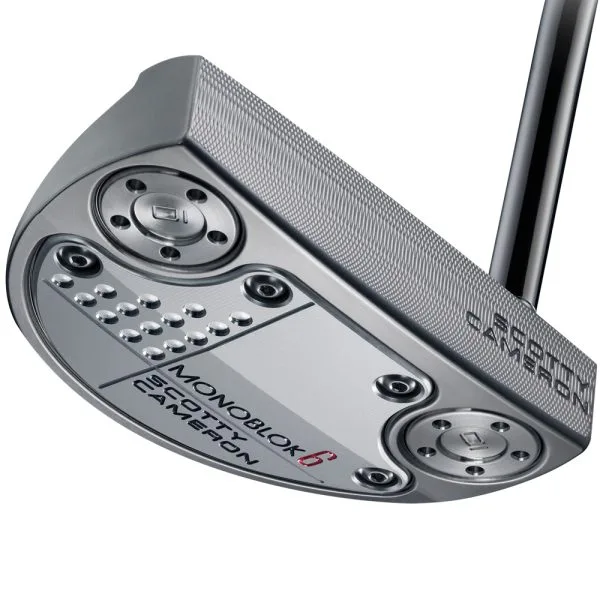 SCOTTY CAMERON MONOBLOK 6: With its rounded compact mallet shape based on earlier GOLO putters, the MONOBLOK 6 is sized in between the GOLO 5 and 7 models with a mid-bend shaft for a nearly face-balanced setup. Precision milled from a single block of 303 stainless steel, the MONOBLOK 6 has an integrated sole plate machined from 6061 aircraft aluminium. Seamlessly fused to the body, this configuration allowed Scotty to design more solid stainless steel into the face and perimeter, increasing MOI, balance and feel. The limited-release MONOBLOK 6 has a solid face, misted stainless steel finish, adjustable performance balanced stainless steel sole weighting and includes a Pistolero Plus grip and a MONOBLOK headcover.